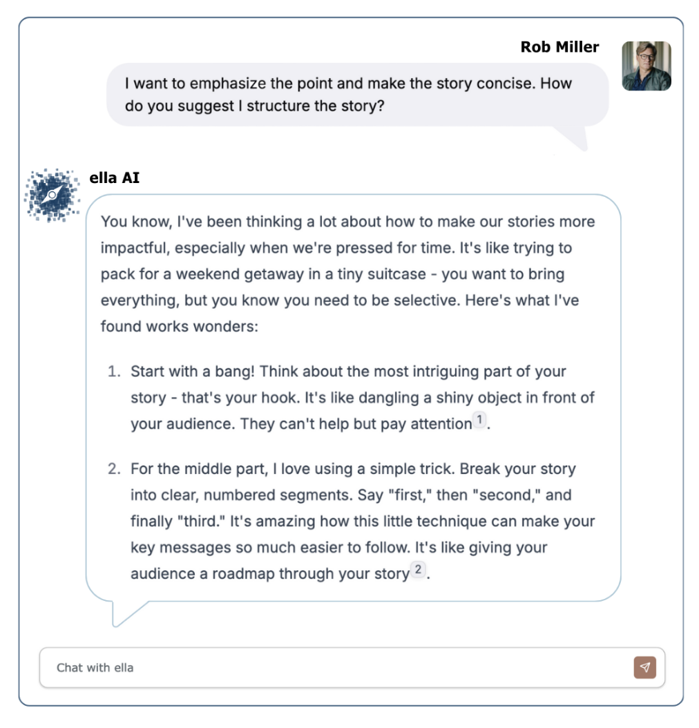 Rob had the nugget of an idea for this story. This experience had been personally meaningful and now he was ready to share about it as a leadership story. So he turned to ella AI to learn how to turn his experience into a well-crafted, concise story.